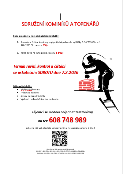 Drůbežárna Prace bude v úterý 27.1.2026 ve 13:30 hodin na návsi v Prosetíně prodávat: mladé kuřice, krmivo pro drůbež a králíky, vitamínové doplňky a dále pak vykupovat králičí kožky-cena 10Kč/ks. Sdružení kominíků a topenářů bude v našich obcích 7.února 2026 po předešlé domluvě na telefoním čísle 608 748 989 provádět kontrolu a čištění komínů pro plyn a tuhá paliva za cenu 550 Kč, revize kotle na tuhá paliva za cenu 1.300Kč. Dále nabíízí služby: vložkování komínů, frézování komínů, strojní odstranění dehtu, výchozí-kolaudační revize na komín.