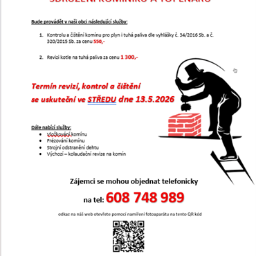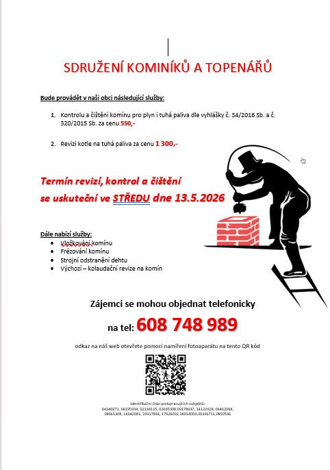 3. Sdružení kominíků a topenářů bude provádět v našich obcích ve středu 13.5.2026 požadované kontroly a čištění komínů pro plyn i tuhá paliva dle zákona za následující ceny. Čištění komínů za 550Kč, revize kotlů na tuhá paliva za 1.300Kč.Dále nabízí levné vložkování a frézování komínů, výchozí-kolaudační revize. Zájemci se mohou objednat na telefinním čísle 608 748 989.