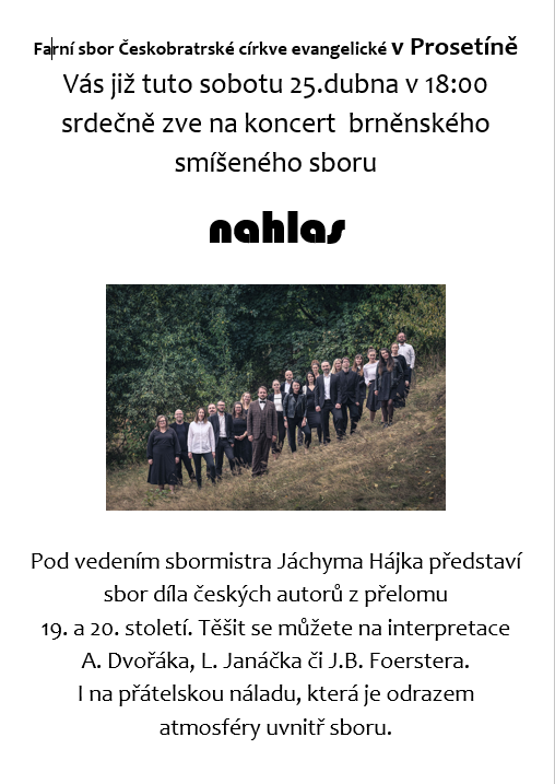 1. Farní sbor Českobratrské církve evangelické v Prosetíně vás zve na koncert, který se bude konat tuto sobotu 25. dubna 2026 v 18:00 v evangelickém kostele v Prosetíně. Jde o koncert brněnského smíšeného pěveckého sboru „Na hlas“, který pod vedením sbormistra Jáchyma Hájka představí díla mistrů české klasiky např. Leoše Janáčka, Antonína Dvořáka či Josefa Bohuslava Foerstera. Těšíme se a srdečně zveme. Vstupné na koncert je dobrovolné.