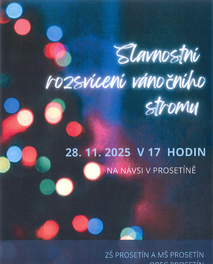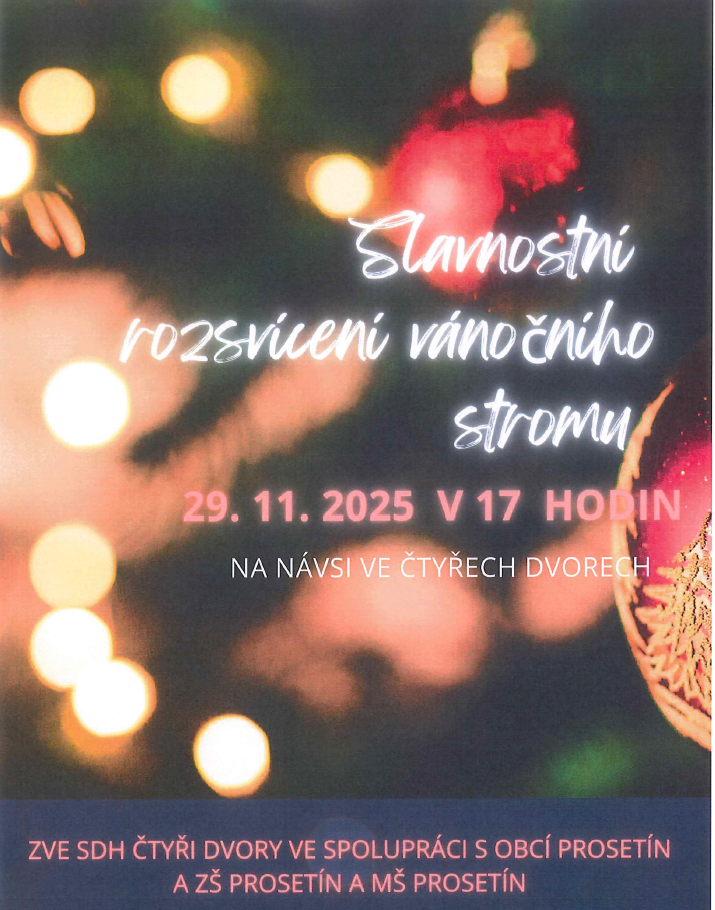 SDH Prosetín zve své členy na schůzi v sobotu 22.listopadu 2025 od 18 hodin v místním pohostinství v Prosetíně. Základní škola Prosetín a Mateřská škola Prosetín ve spolupráci s obcí Prosetín a SDH Prosetín zve na slavnostní rozsvícení vánočního stromu v pátek 28.listopadu 2025 od 17 hodin na návsi v Prosetíně. SDH Čtyři Dvory ve spolupráci s obcí Prosetín a Základní školou Prosetín a Mateřskou školou Prosetín zve na slavnostní rozsvícení vánočního stromu v sobotu 29.listopadu 2025 v 17 hodin na návsi ve Čtyřech Dvorech.
