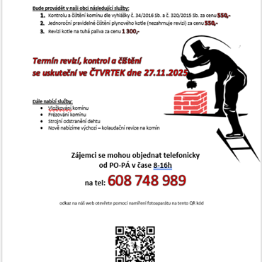 Sdružení kominíků a topenářů bude provádět v naších obcích ve čtvrtek dne 27.11 požadované kontroly a čištění komínů dle zákona za následující ceny: čištění komínů: 550 Kč, čištění plynových kotlů: 550 Kč, revize kotlů na tuhá paliva: 1 300 Kč. Dále nabízí levné vložkování a frézování komínů, výchozí-kolaudační revize. Zájemci se mohou objednat telefonicky na telefonním čísle: 608 748 989. Drůbežárna Práce bude v sobotu 15.11.2025 ve 13:30 hodin na návsi v Prosetíně prodávat: mladé kuřice, slepice ve snášce, krmivo pro drůbež a králíky, vitamínové doplňky a dále pak vykupovat králičí kožky-cena 10 Kč/ks. Oznamujeme občanům, že dne 11.11.2025 nebude z organizačních důvodů knihovna v Prosetíně. Spolek prosetínské hřbitovy zve všechny na úklid listí na dolním hřbitově ve čtvrtek 13.11.2025 v 15 hodin. Prosím vezměte si s sebou koše a hrábky. Děkujeme.